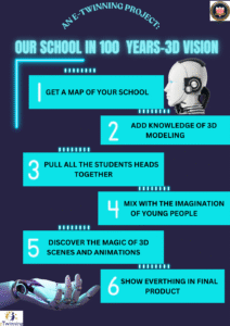 ‘Projenin adı Our school in 100 years-3d vision’. Fikrimiz, bir sınıftaki öğrencilerin yardımıyla geleceğin okulunun bir modelini oluşturacağımızdır. Havada asılı sandalyeler, farklı işlevlere sahip robotlar, sadece bilim kurgu olabilir. Belki bazı fikirlerin gerçek uygulama için ilham kaynağı olabileceğini düşünüyoruz. Projede, öğrencilerin okulda neleri özlediklerini ve orada kalışlarını nelerin iyileştireceğini göreceğiz. Açık kaynaklı Blender programında çalışıyoruz. Projede 2 Ortaklı olup 1 Türk, 1 slovak ortakla yürütülmektedir. Öğrenciler ve öğretmenler proje ile 100 yıl sonraki okulların nasıl olabileceğini üç boyutlı olarak tasarlayacaklardır.